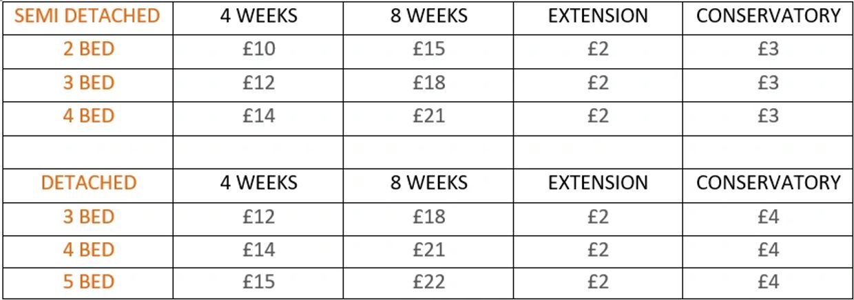 Here is a price guide to give you an idea on how much your property will cost. For example a 3 bedroom detached with a conservatory that is being cleaned on a 4 weekly basis = £16